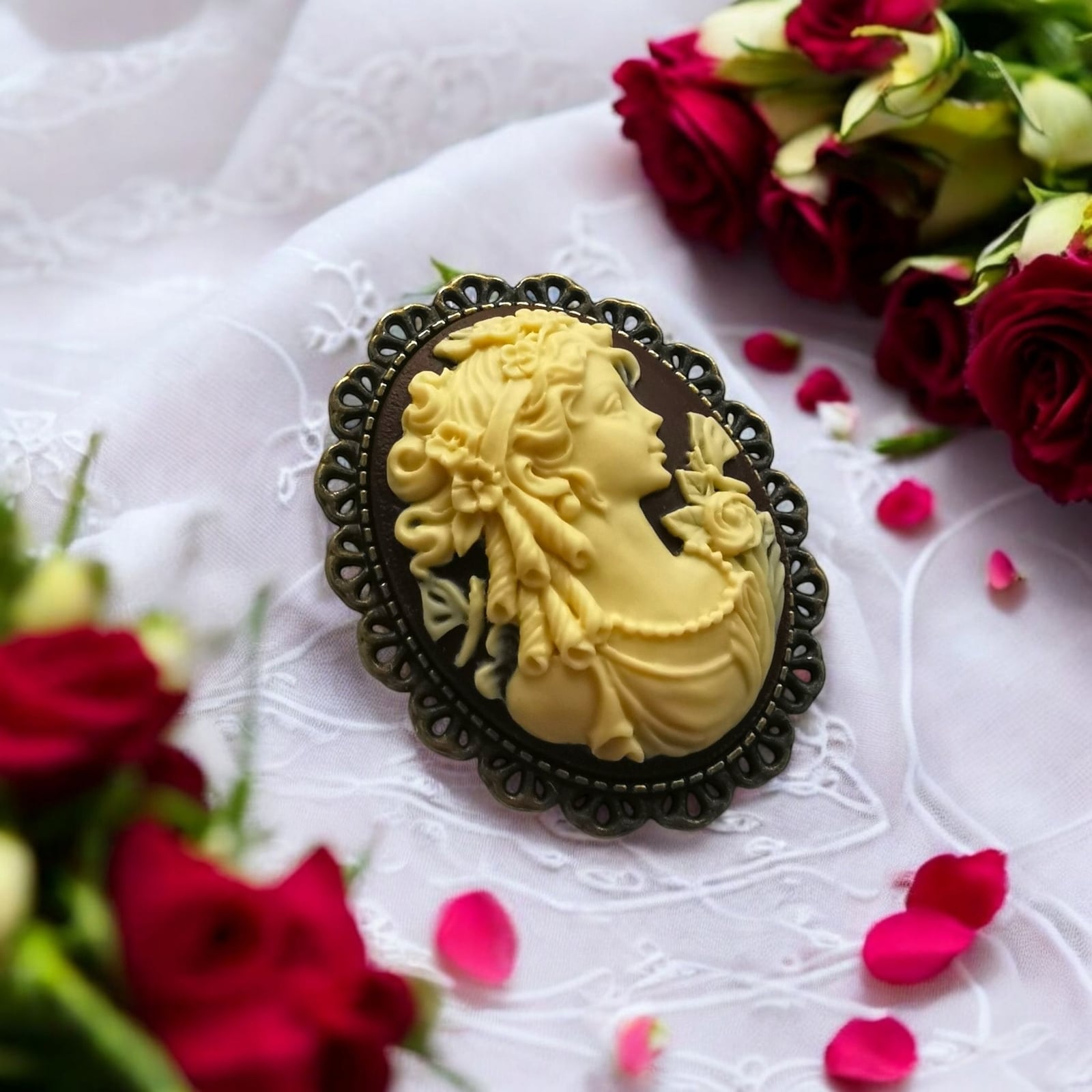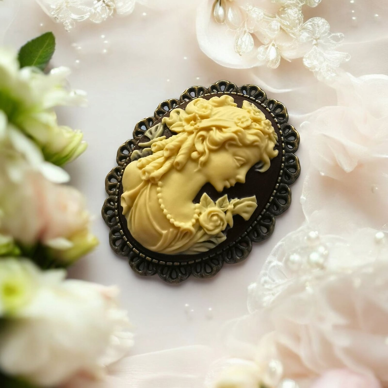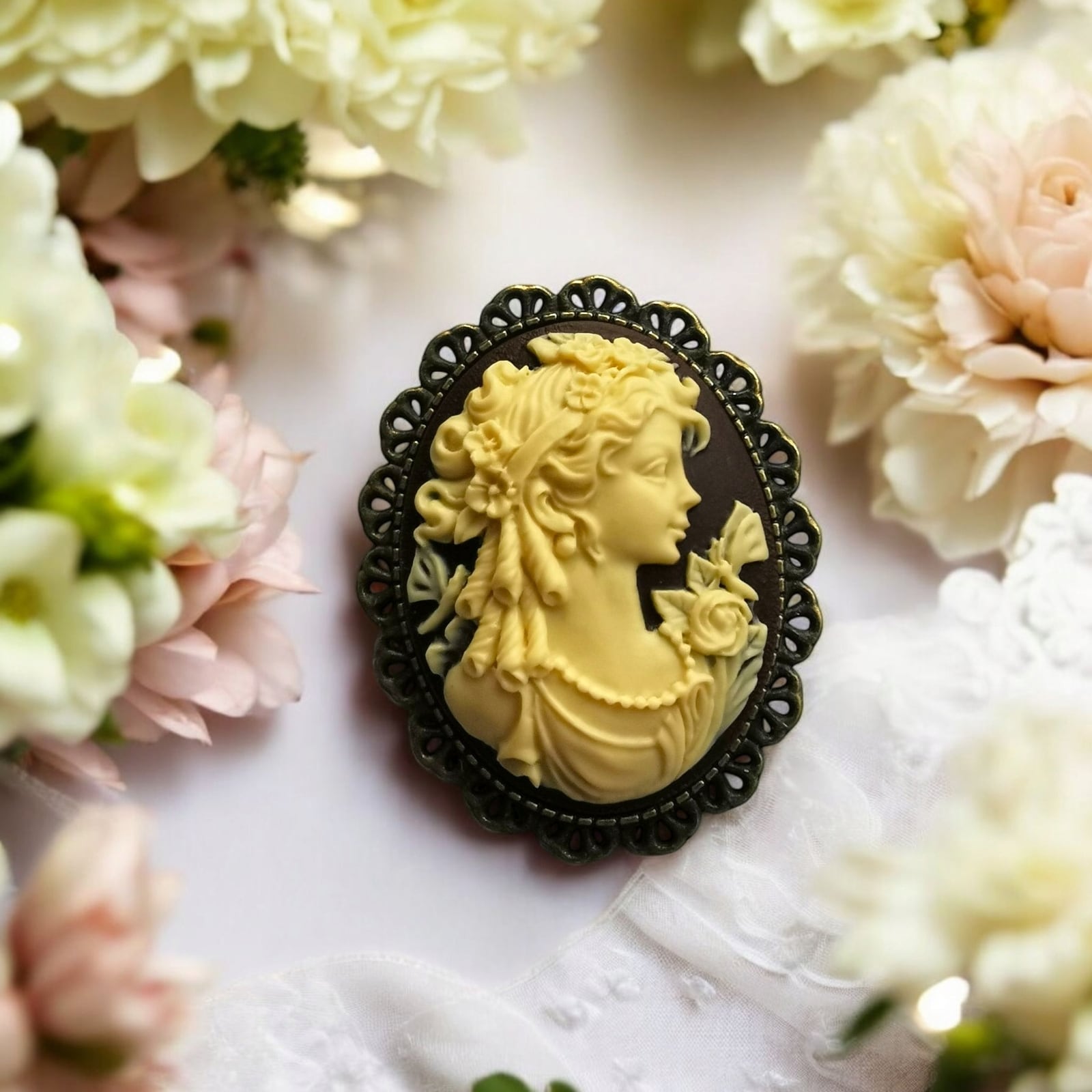 細部までこだわり抜かれた彫刻と、ヴィンテージ調の魅力を兼ね備えたこのカメオブローチで、気品あふれるスタイルをお楽しみください。
