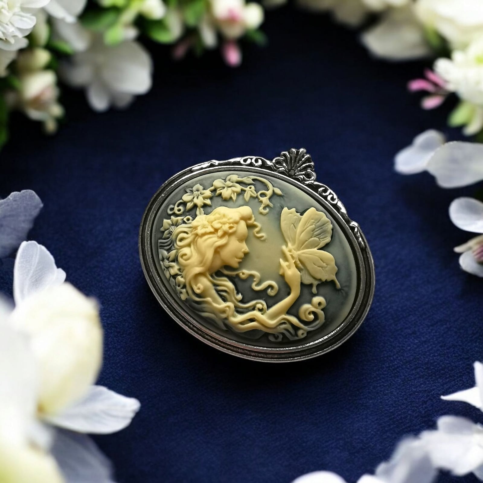 繊細なレリーフに刻まれたのは、神秘的なフェアリーと優雅に舞う蝶のひととき。風に揺れる髪、指先に触れようとする蝶の儚さ、そして周囲を彩る幻想的な花々……まるで一枚の絵画のような、ストーリーを感じさせるカメオブローチです。