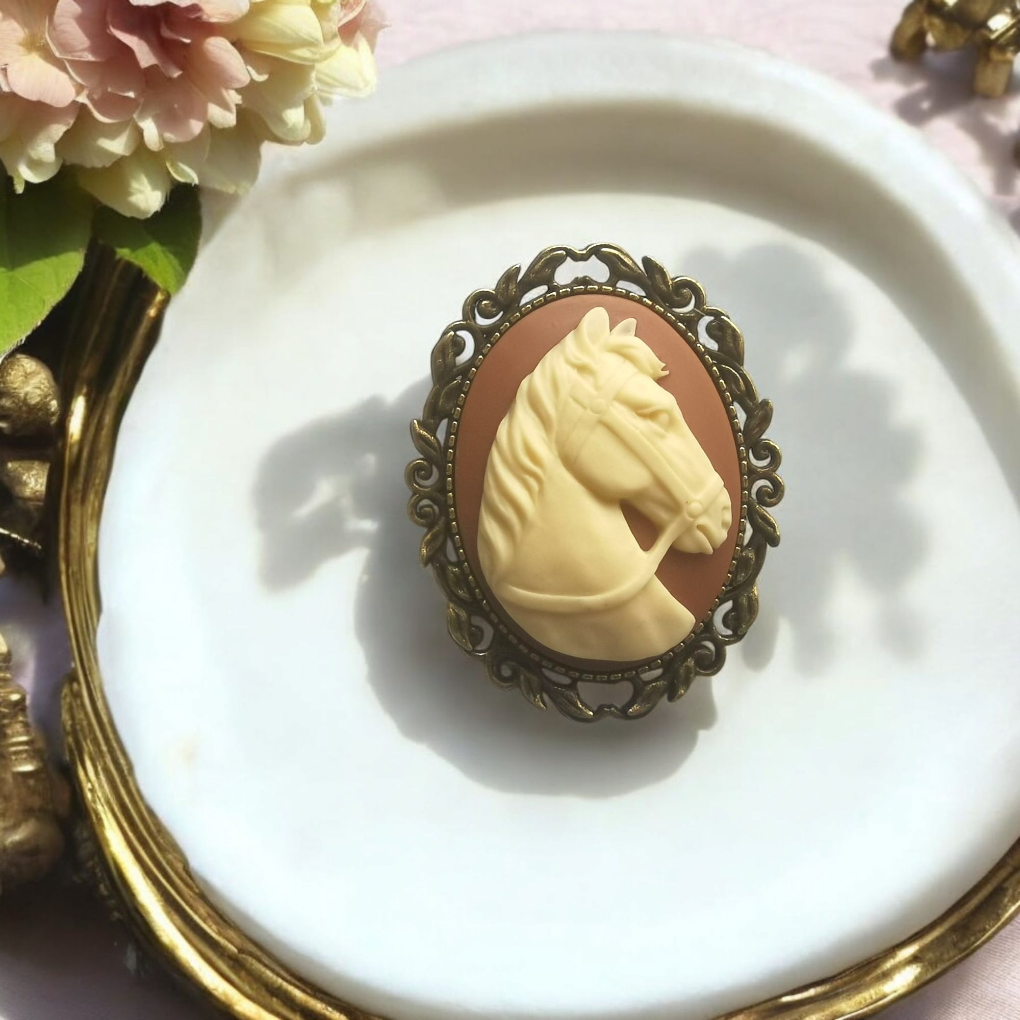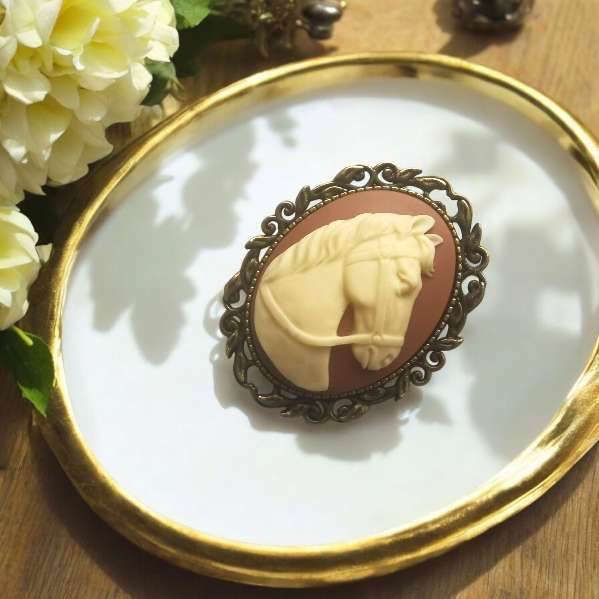 躍動と優雅さをあわせ持つ、美しい馬の横顔を刻んだカメオブローチ。