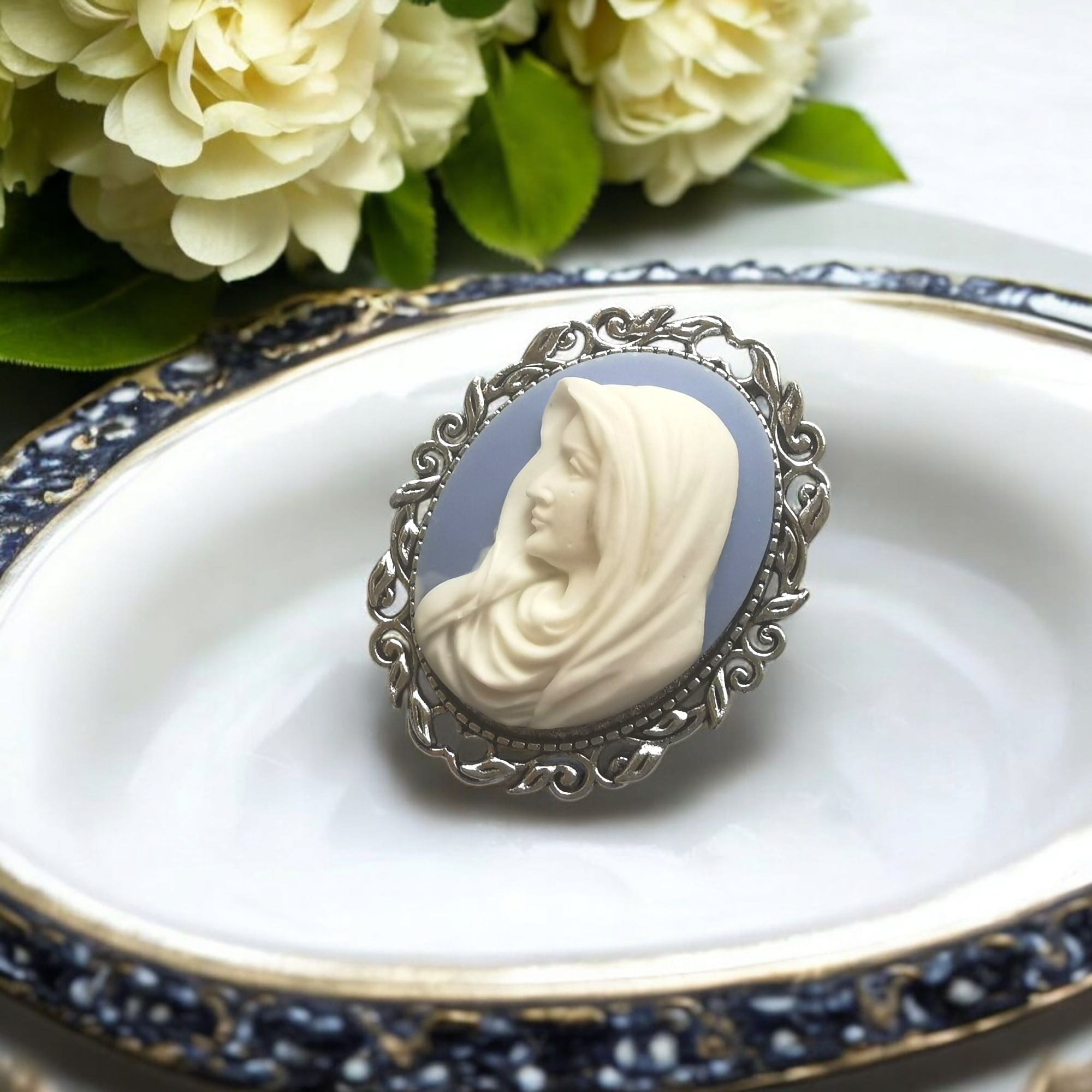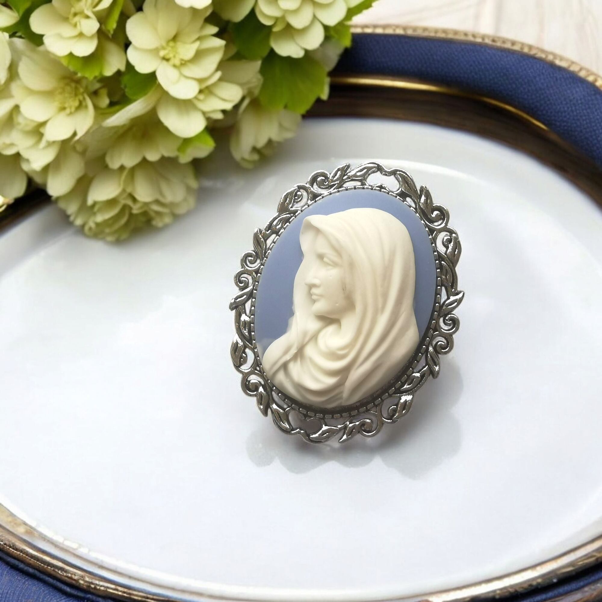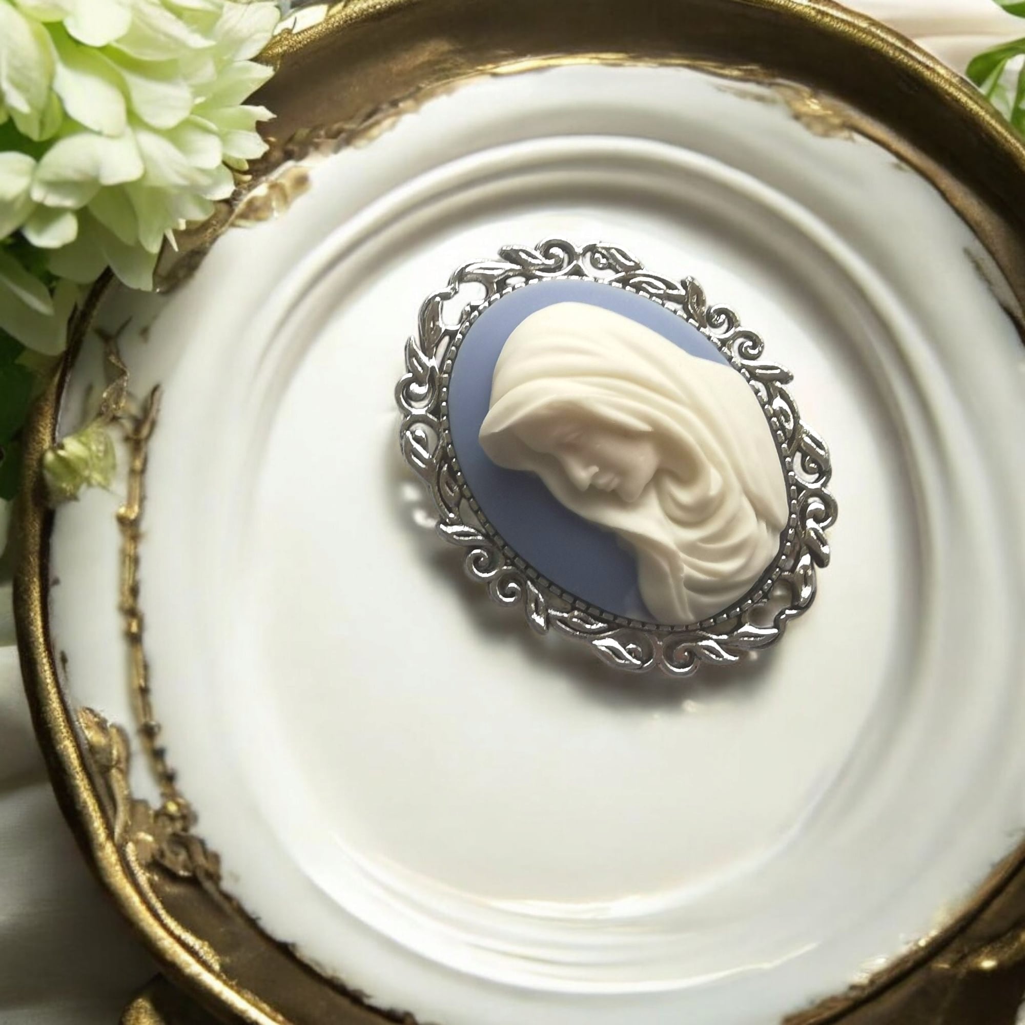 清らかで崇高な存在を象徴するこのカメオブローチは、見る人の心にそっと安らぎを届けてくれるような優しさにあふれています。