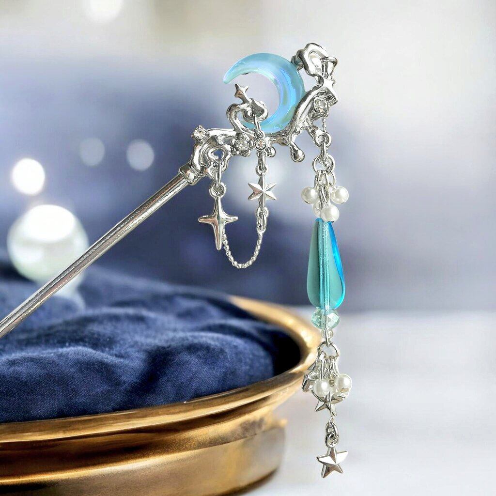 その傍らには星々が連なり、揺れるたびにささやくような音ときらめきを放ちます。淡いブルーのしずく型ガラスは、まさに月が落とした雫のよう。透明感のある輝きが、髪元に静かな魔力を宿します。