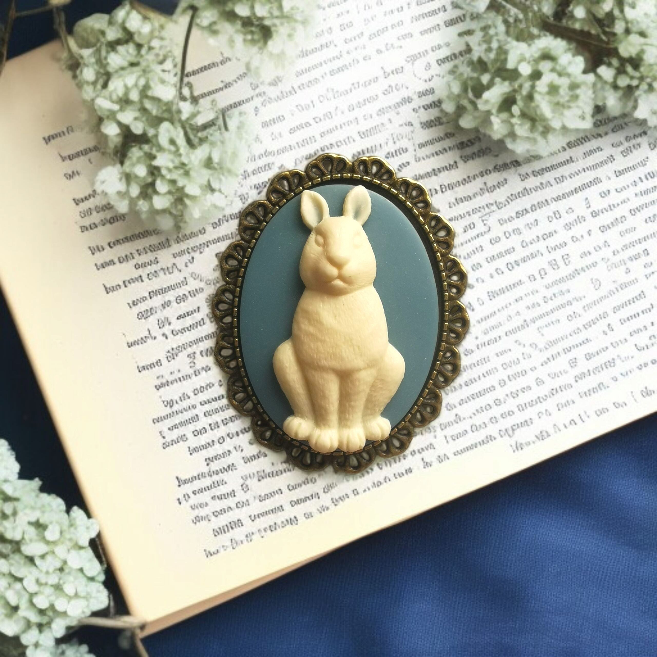 まっすぐ前を見つめて座るうさぎが印象的な、クラシカルな雰囲気のカメオブローチです。