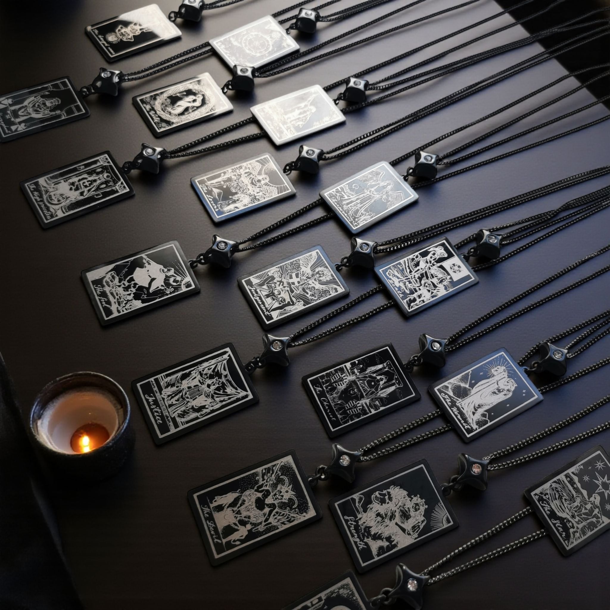 このシリーズでは、22枚の大アルカナそれぞれに込められた意味を、繊細な線刻でステンレスプレートに刻み込み
