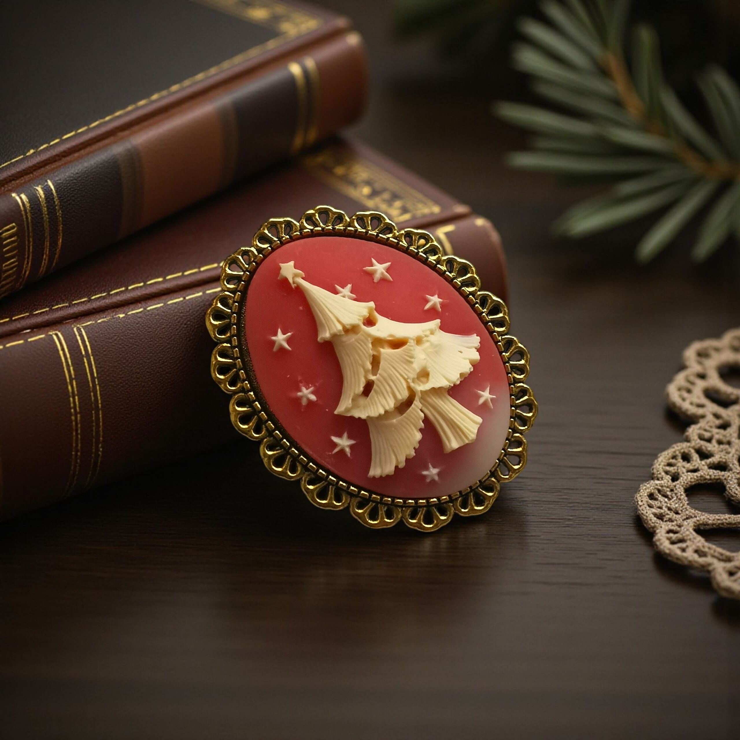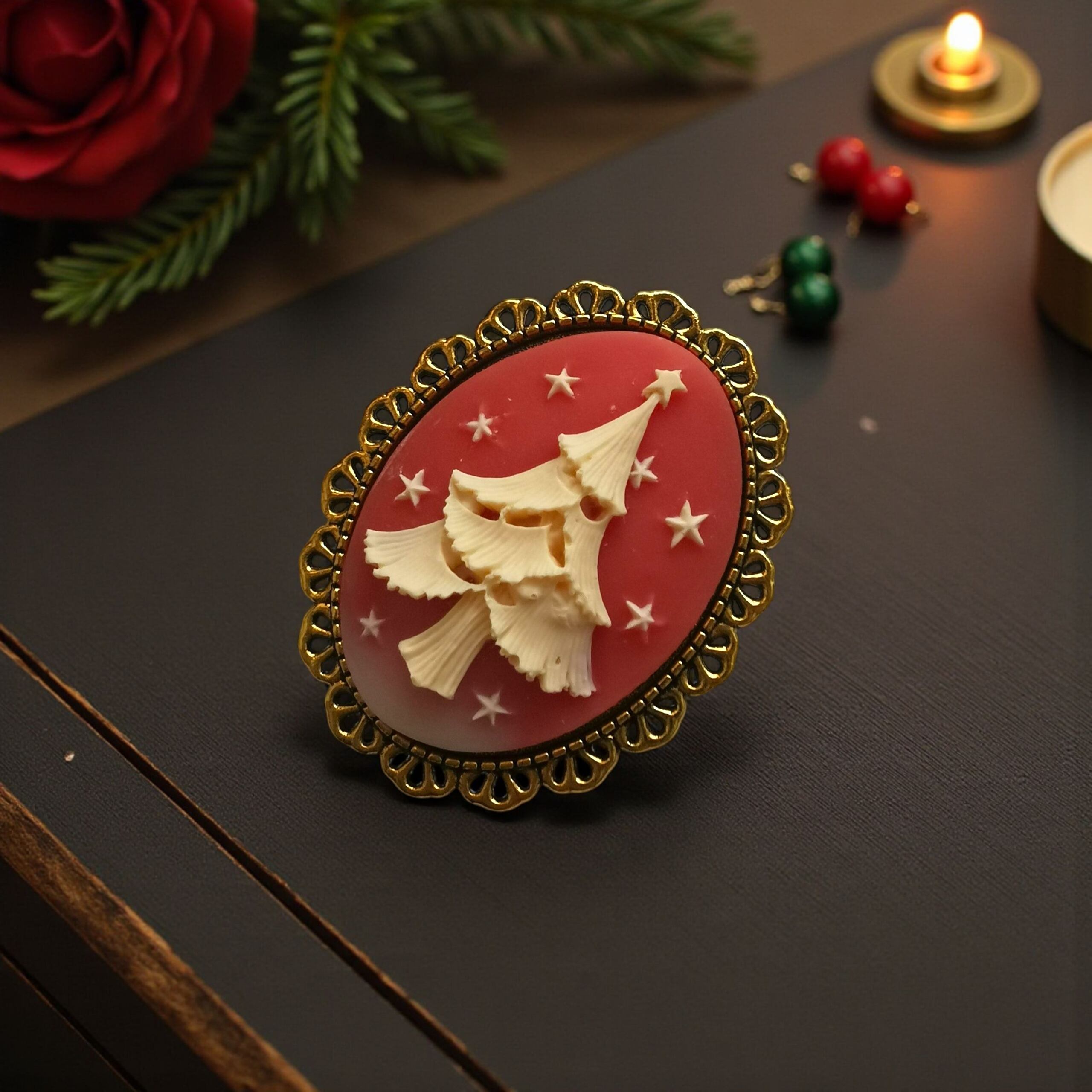 このブローチは、そんな“聖夜の物語”を小さなカメオの中に閉じ込めた作品です。