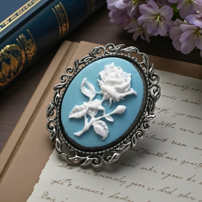 その姿は、時を超えて語り継がれる秘密の庭の記憶のよう。凛とした気配と儚さを併せ持つ、幻想的なカメオブローチです。
