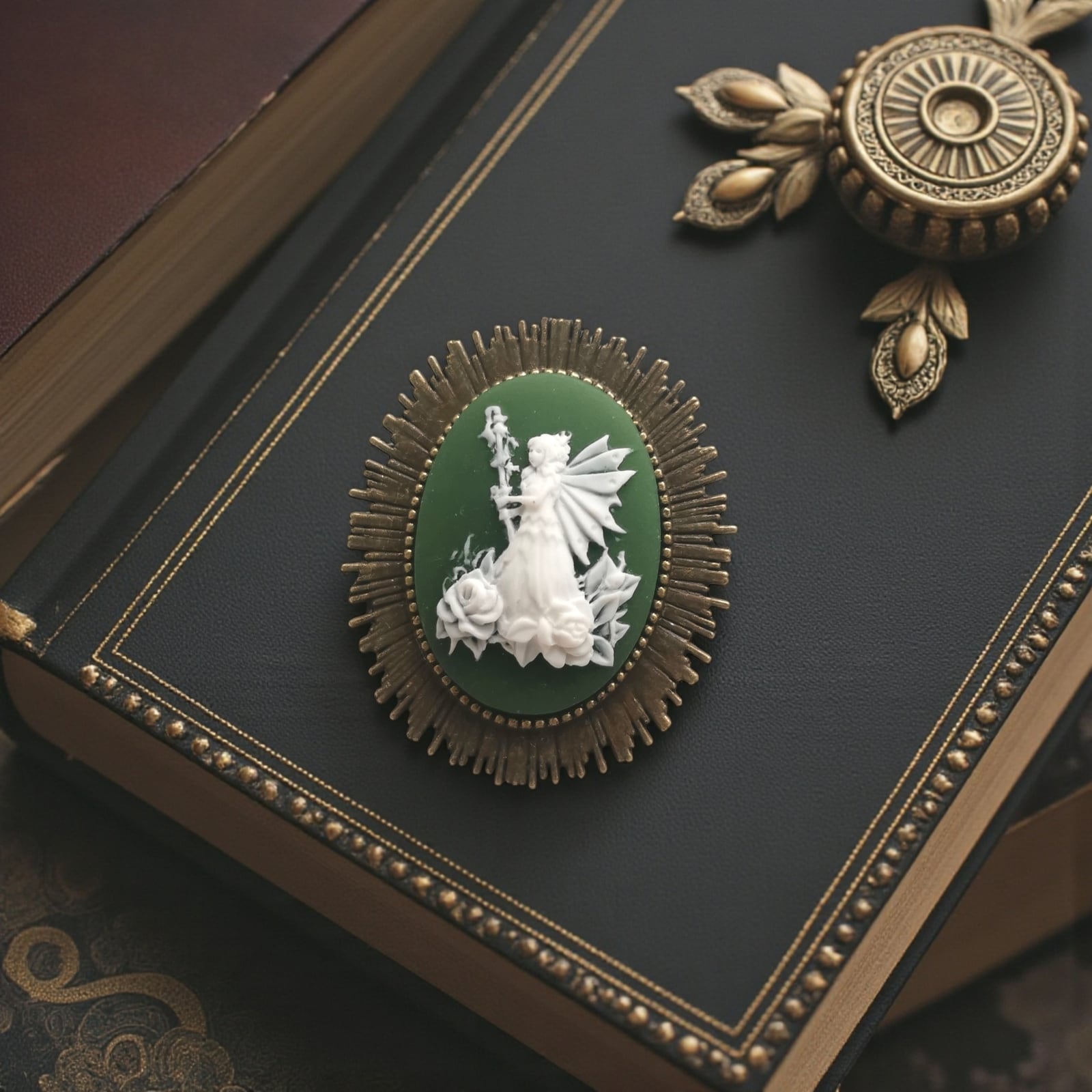 Cameo Brooch #m1 カメオ ブローチ 妖精 グリーン