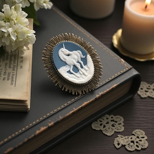 身につけるたび、静かな灯りの下で語られる神話の世界へと心を誘う、一角獣のカメオブローチです。