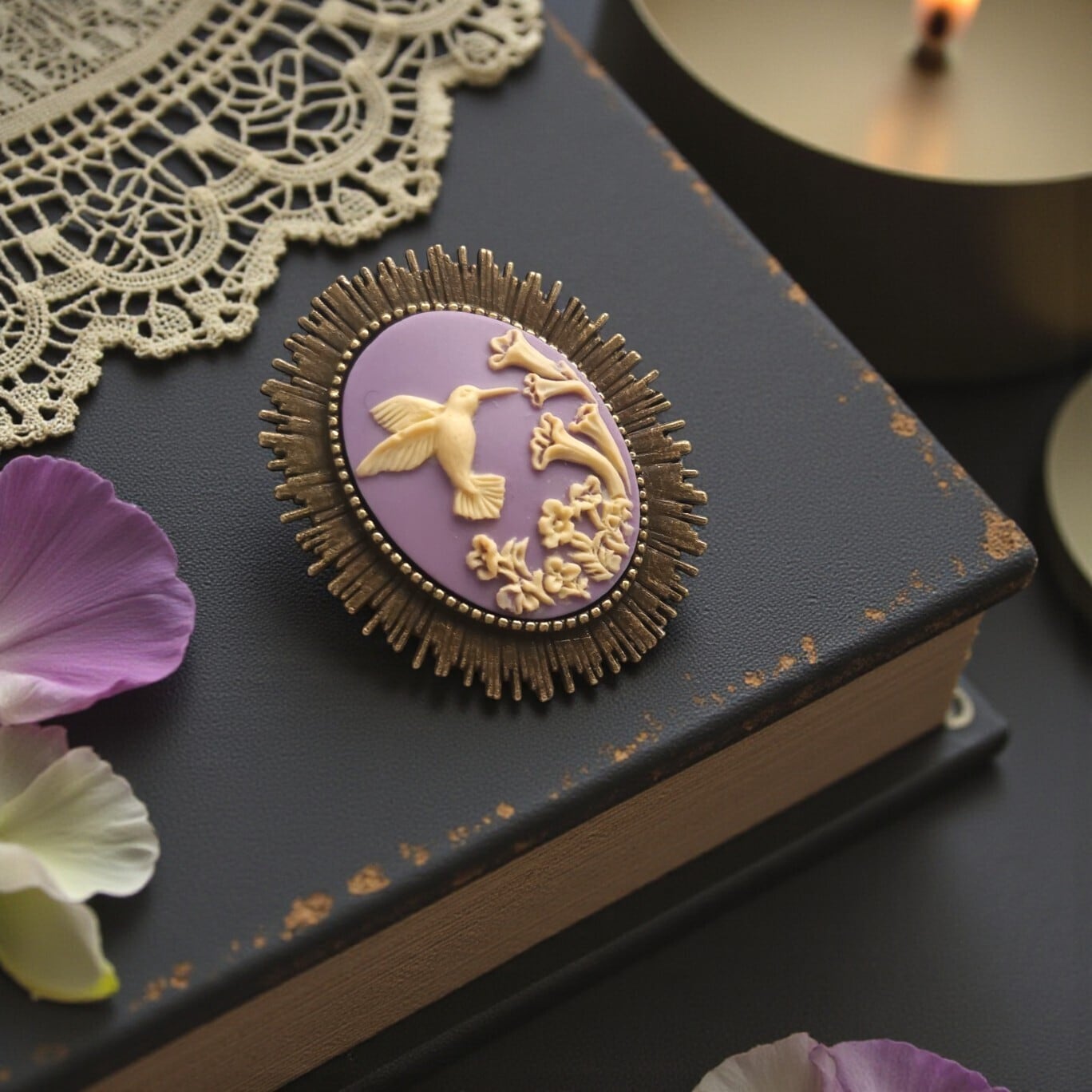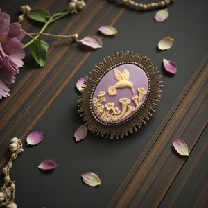 Cameo Brooch #m6 カメオ ブローチ ハチドリ ラベンダー