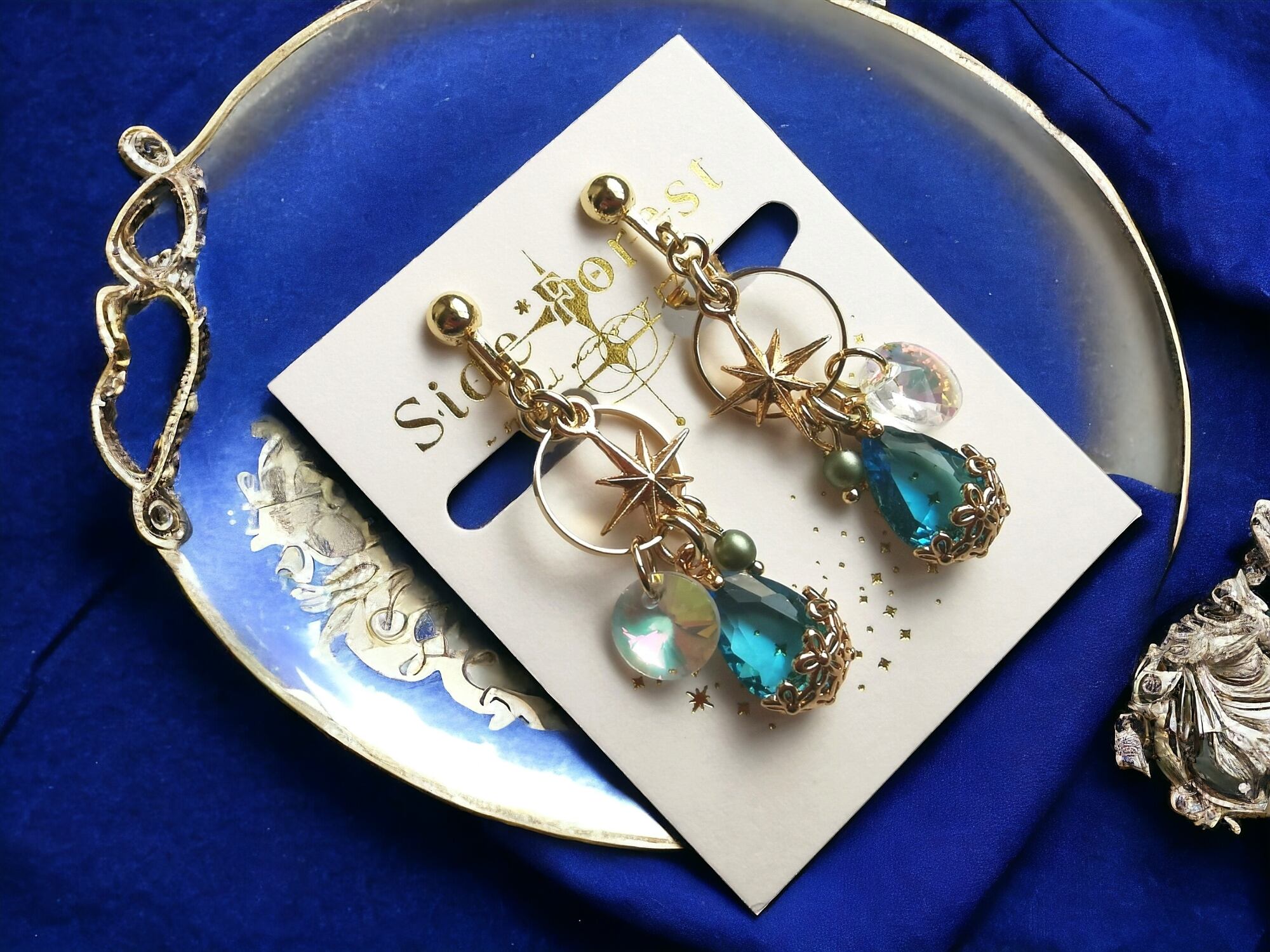 水色のしずく型クリスタルは、繊細なゴールドのフレームに包まれ、エレガントで上品な雰囲気を演出します。さらに、星のモチーフがアクセントとなり、夜空に輝く星々のような幻想的な要素をプラス。クリスタルの透明感とゴールドの温かみが、華やかさと落ち着きを絶妙に調和させています。