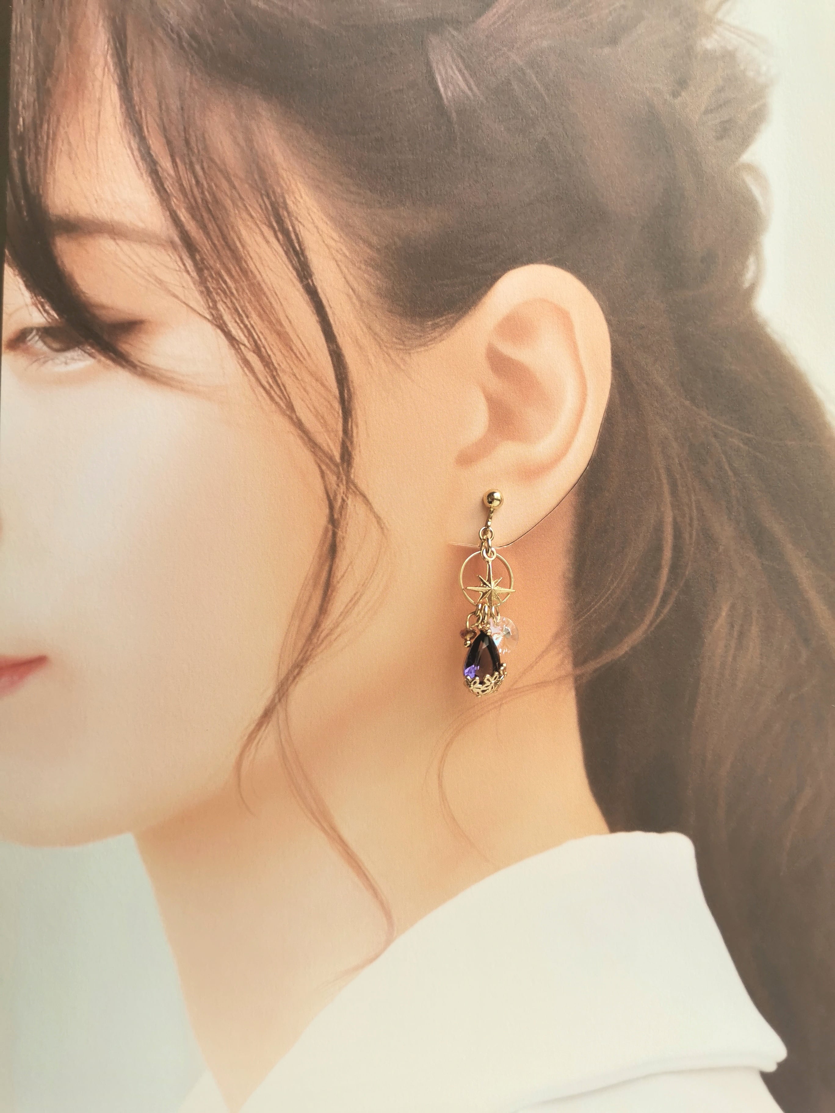耳元で揺れるたびに、クリスタルが艶やかに輝き、洗練された印象を演出します。星のモチーフが組み合わさり、夢や希望を象徴するようなロマンチックな雰囲気を感じさせる一品です。