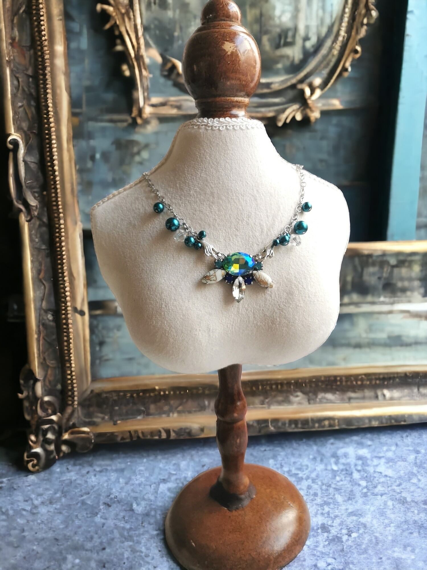 ナベット型やラウンド型のヴィンテージガラスも、ネックレスに深みと彩りを与えています。
