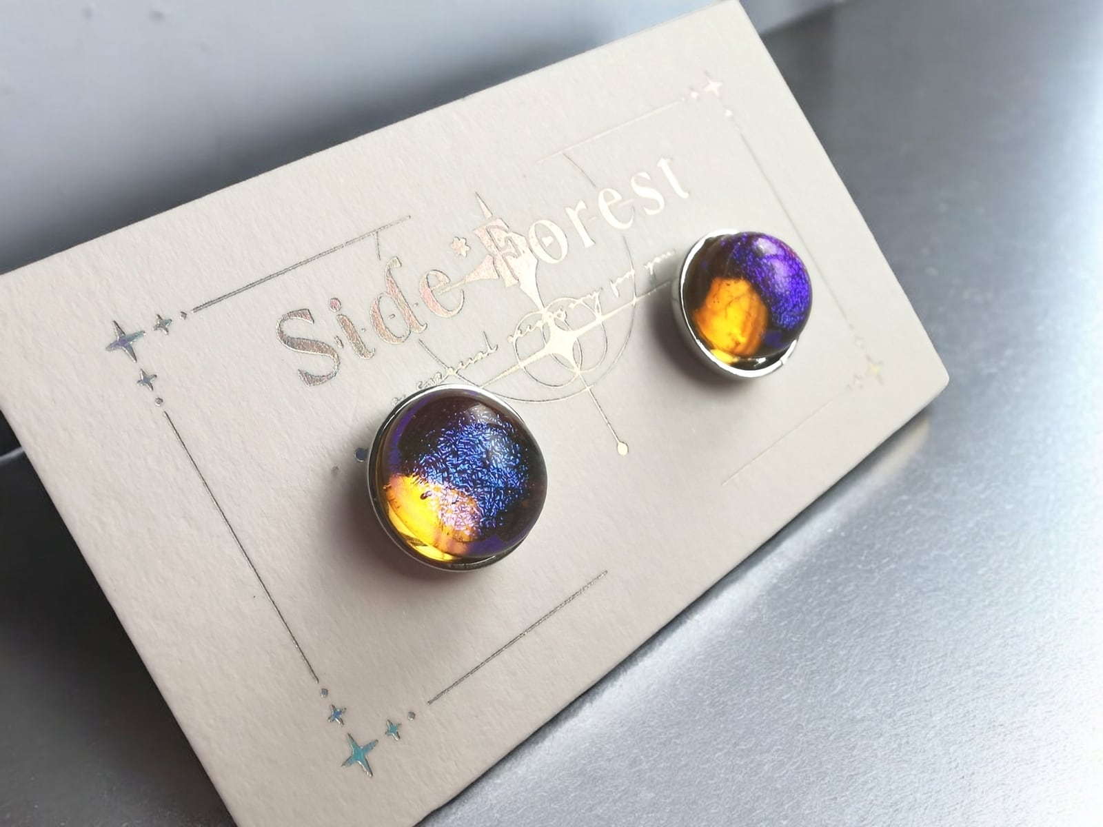 このイヤリングの特徴は、ダイクロガラスという特殊なガラスをフュージングして制作した点です。角度や光の加減によってキラキラと異なる輝きを見せ、見るたびに新たな表情を楽しむことができます。