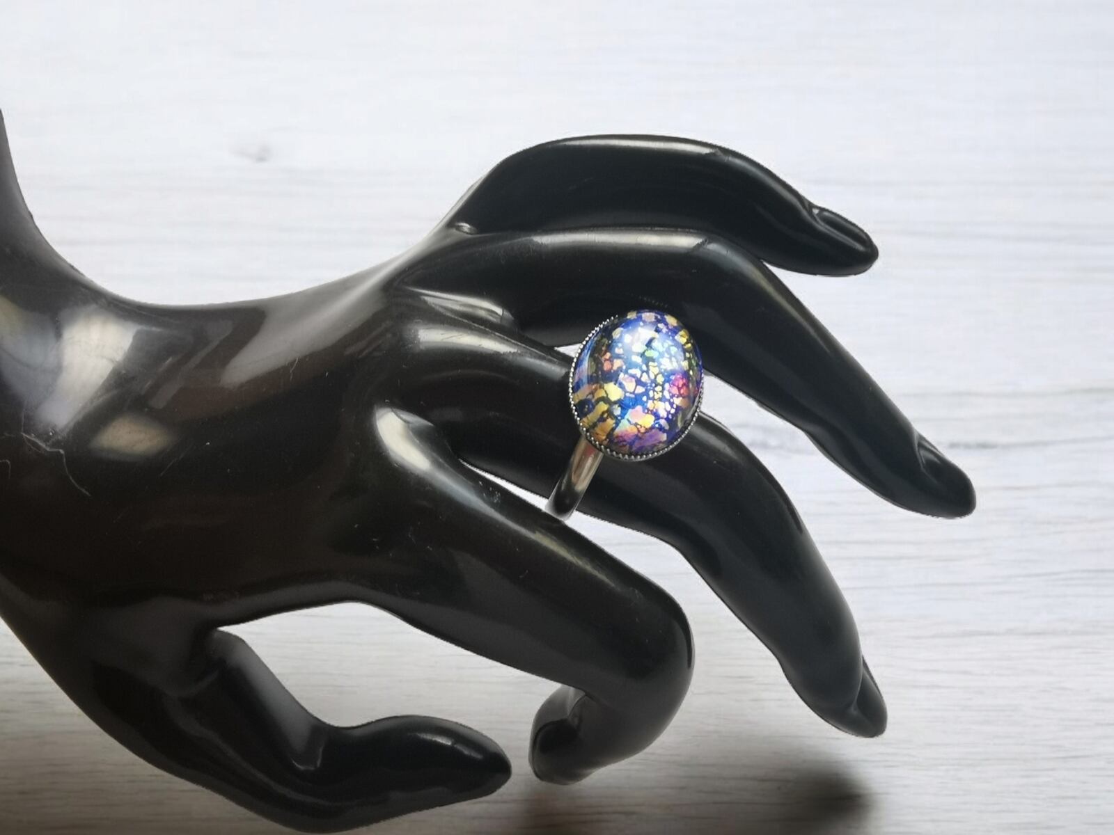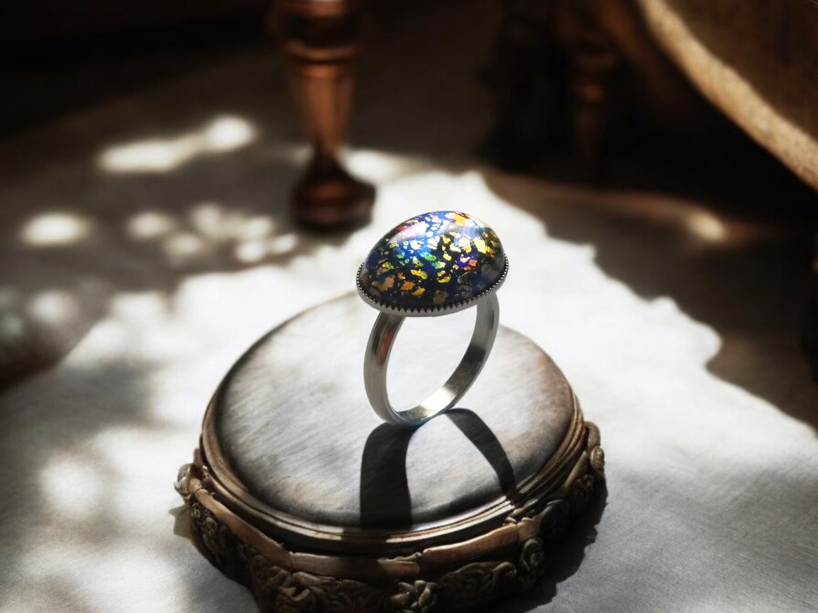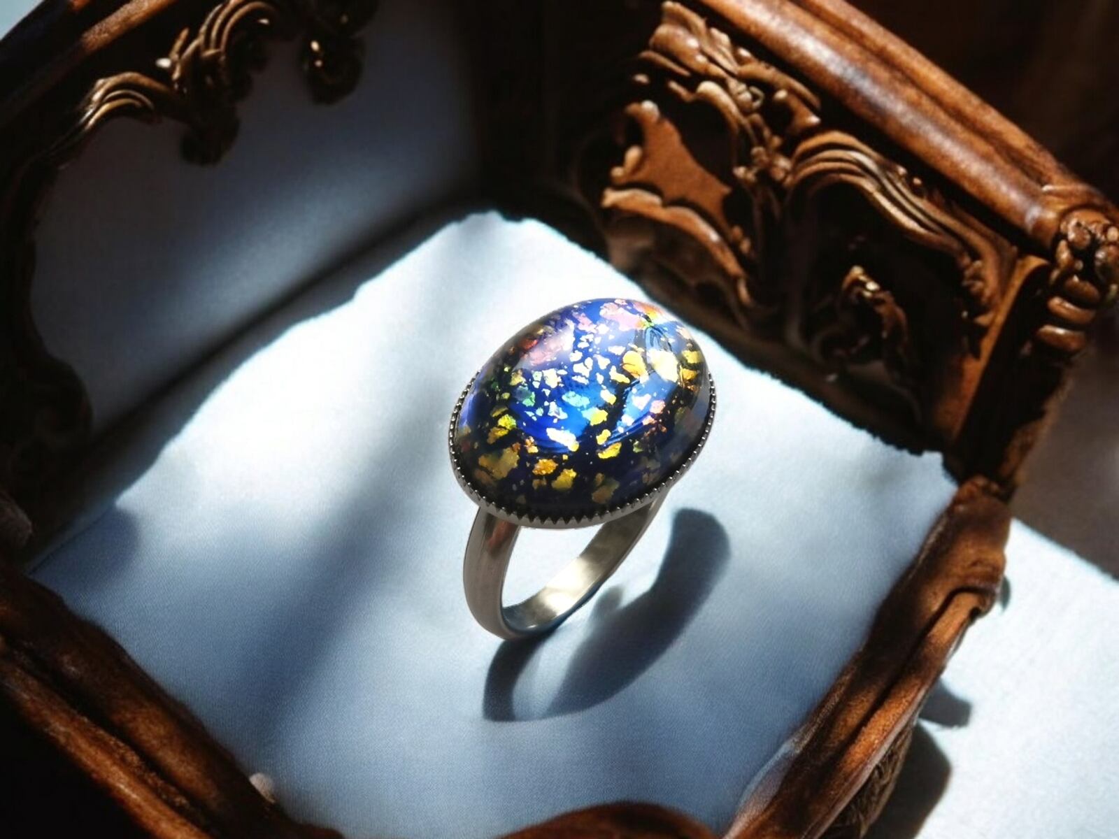 ブラックやネイビー、チャコールグレーといったダークトーンのファッションにこのリングを合わせると、ガラスのブルーが美しく際立ちます。例えば、シンプルなブラックドレスやジャケットスタイルに合わせれば、クールでシックな印象を与え、ブルーファイアオパールの遊色が手元で際立つことで、エレガントで洗練された雰囲気が引き立ちます。