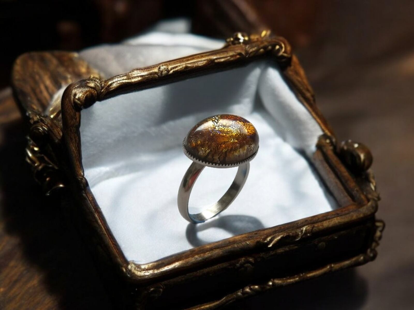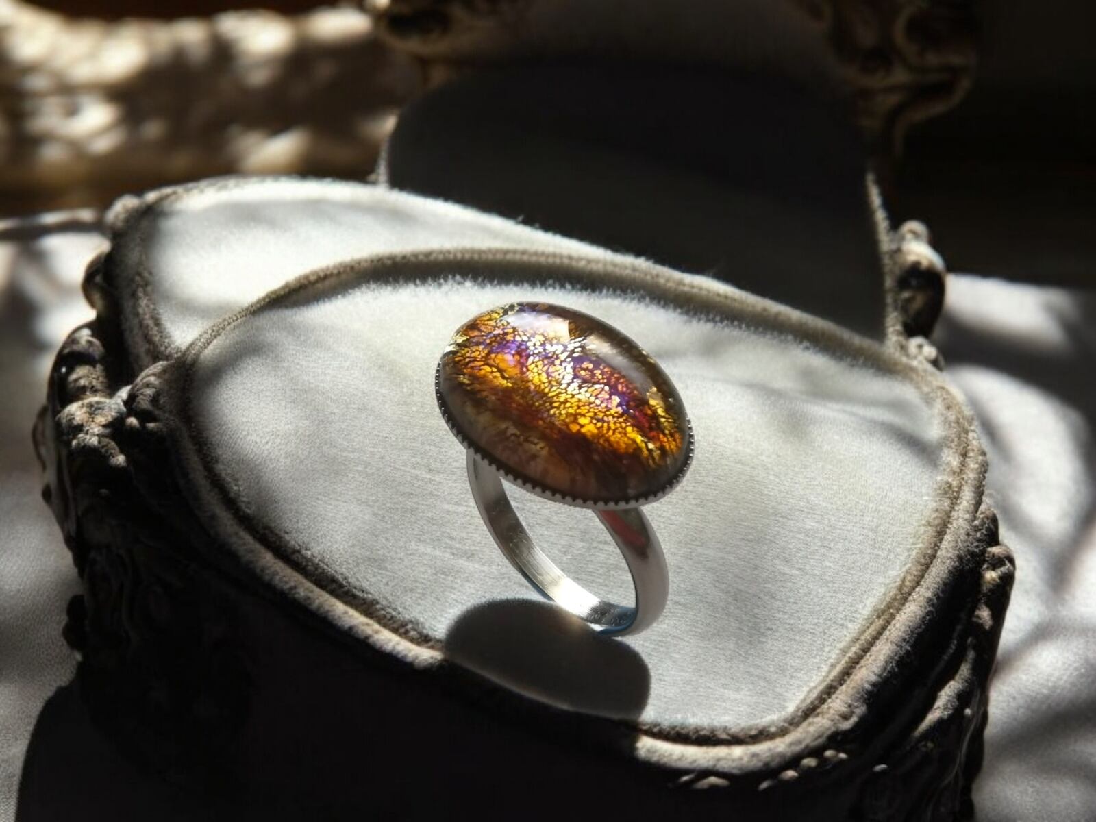 このリングを身に着けた瞬間、まるで太陽の光を指先に纏うような気分を味わえます。晴れた日のお散歩や、友人とのカジュアルなカフェタイムに、このリングがひと際目を引き、手元に柔らかな輝きを添えます。日差しの中で、イエローファイアオパールの鮮やかな遊色が光と共に踊り、まるでその日の心地よさを増幅してくれるかのよう。