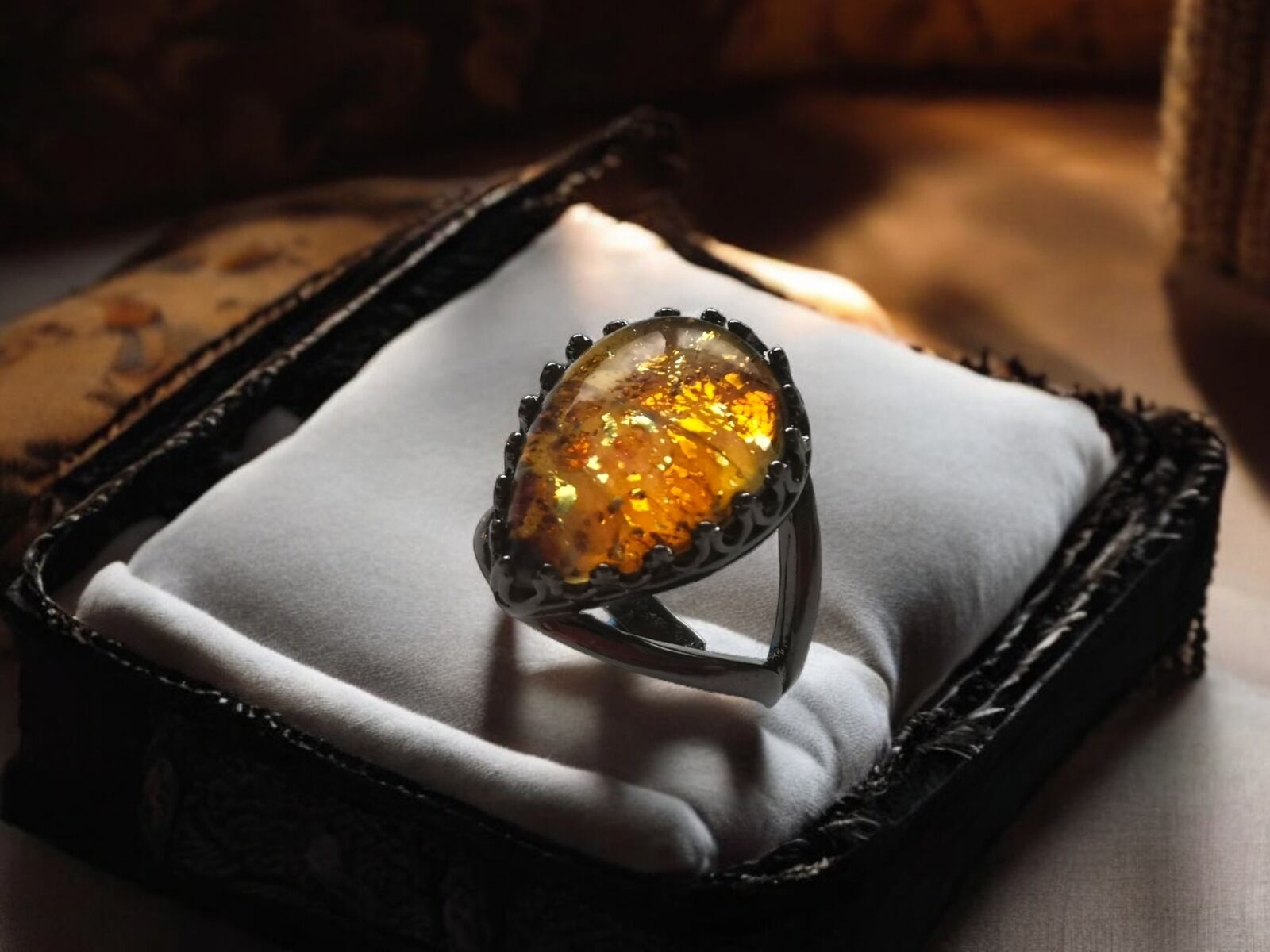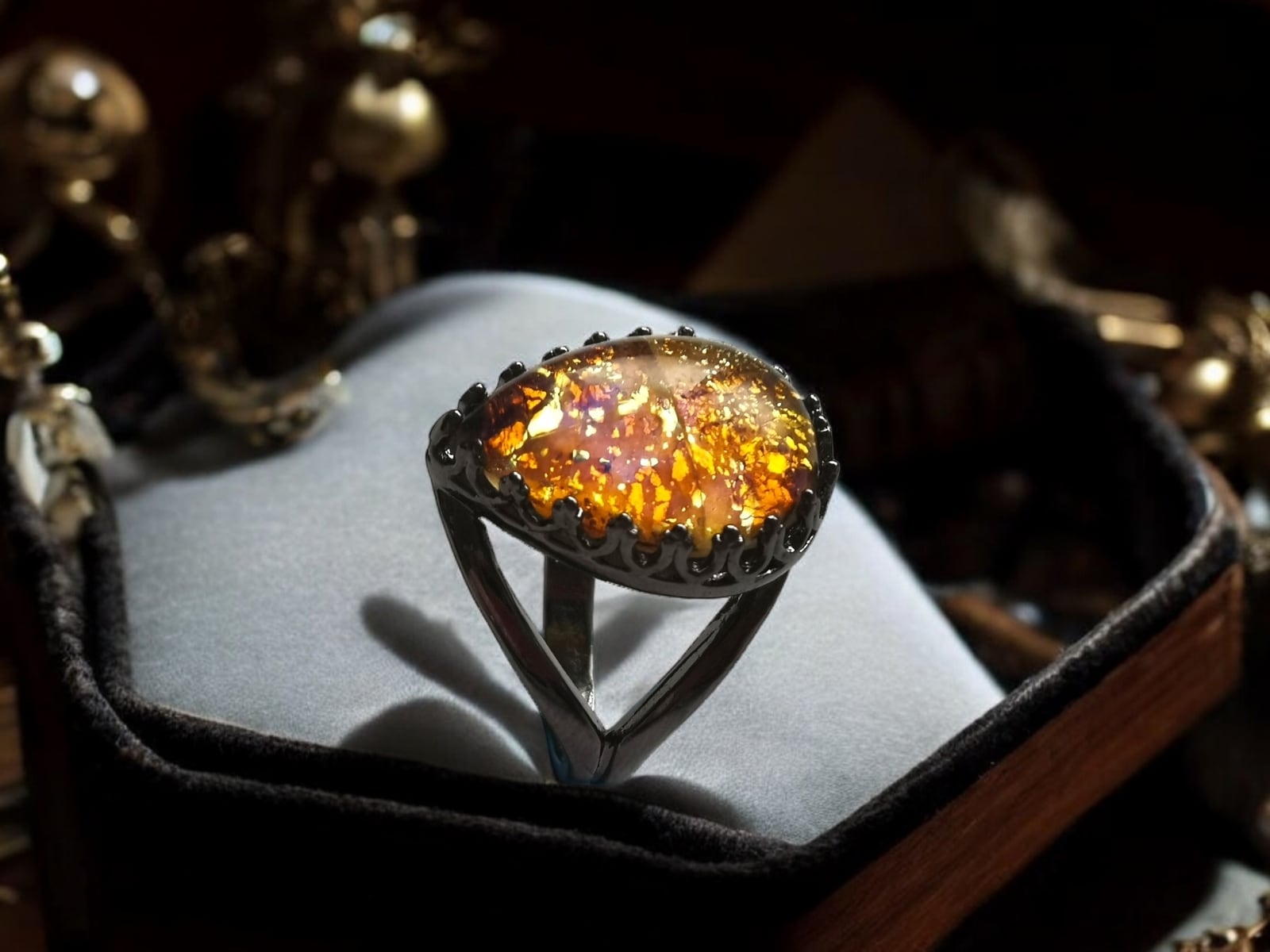 リング部分にはガンメタルカラーのベースを使用しており、光沢感のある深みのある色合いが、ヴィンテージガラスの温かみのある色彩と絶妙にマッチしています。ガンメタルのクールでシックな質感が、リング全体にモダンで洗練された印象を加えています。