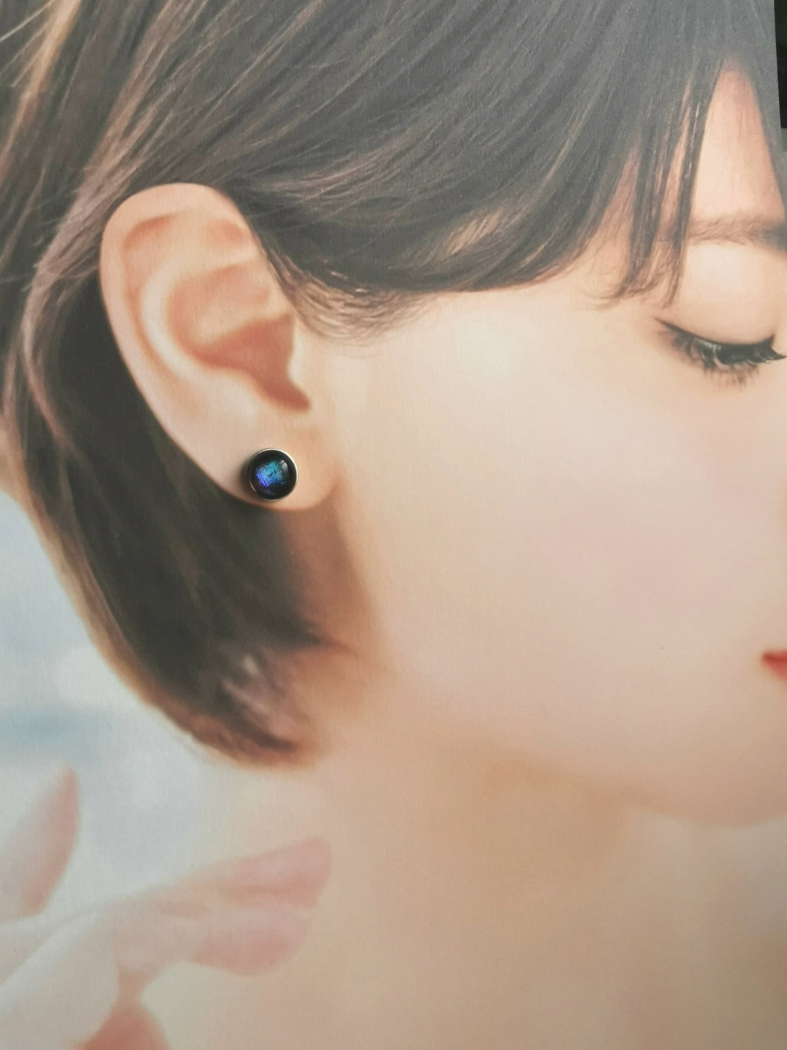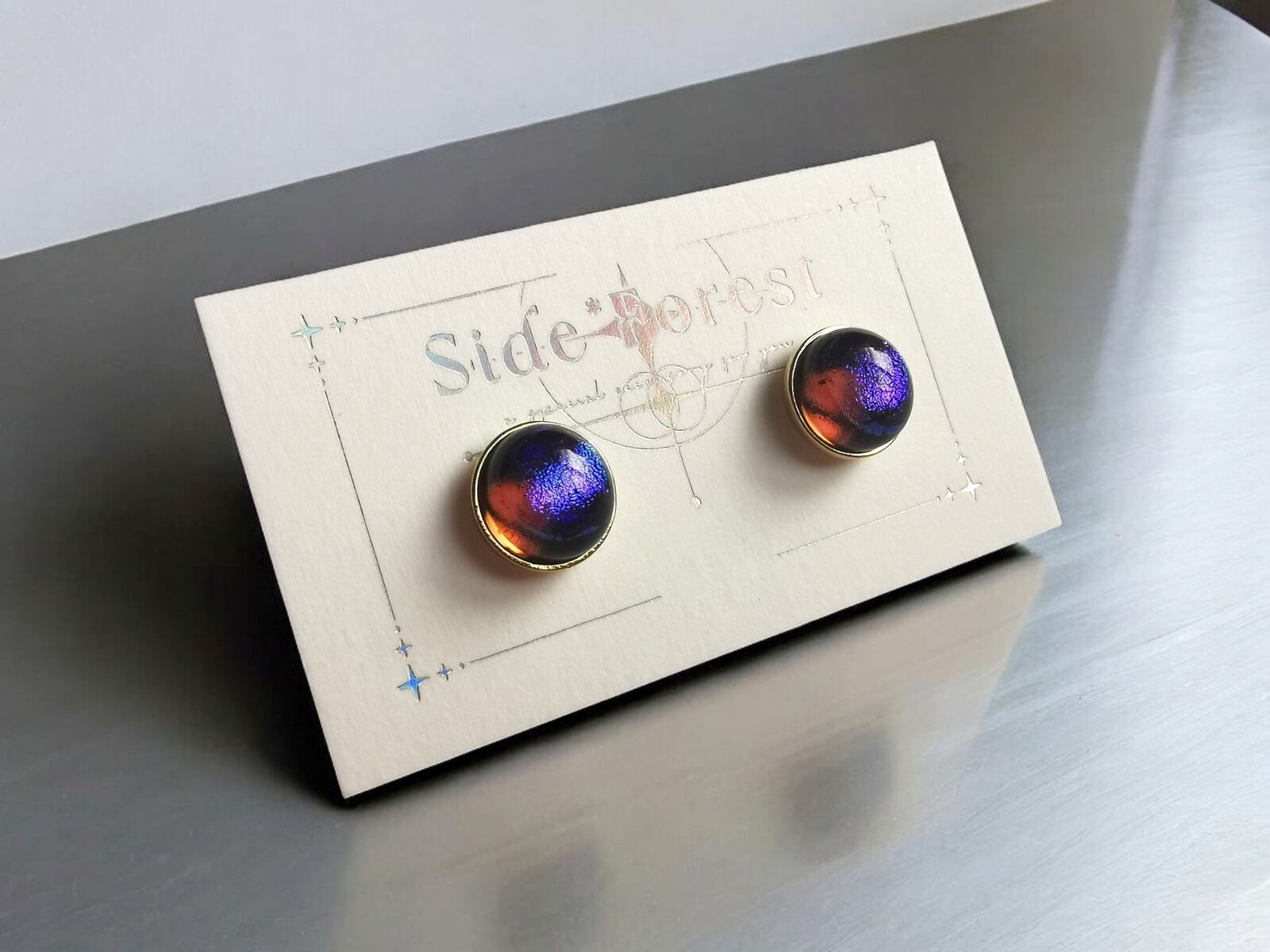 このイヤリングの最大の特徴は、ダイクロガラスという特殊なガラスをフュージングして作り上げたこと。