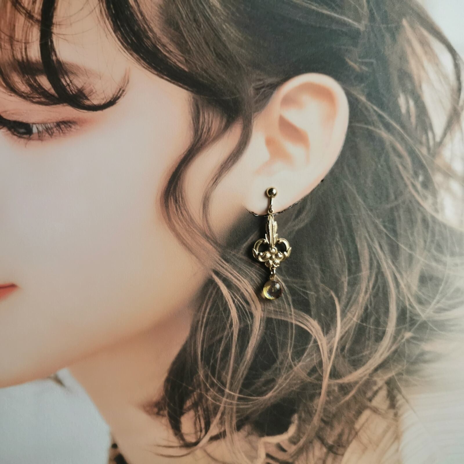 全体のサイズは約3.5cmで、耳元に程よい存在感を演出。ヴィンテージ感のあるブラスパーツが、クラシックで洗練されたスタイルを引き立てます。また、ゴールドの華やかさがアクセントとなり、特別な日の装いにはもちろん、日常使いにも適したデザインです。