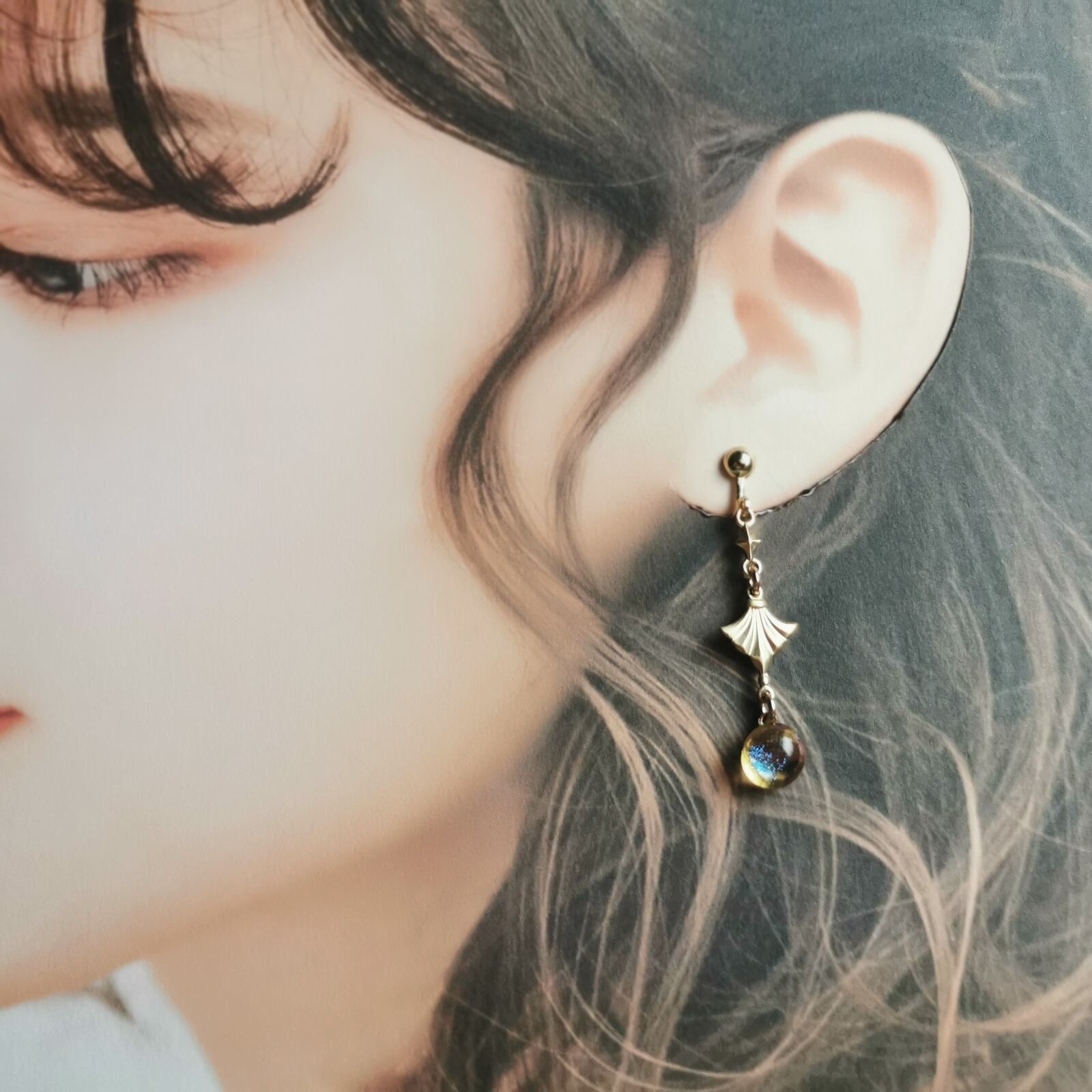 オリジナルのダイクロガラスを使った、個性あふれる手作りイヤリングです。全長3.5cmと程よいサイズで、耳元にさりげない華やかさを添えるデザインが特徴。