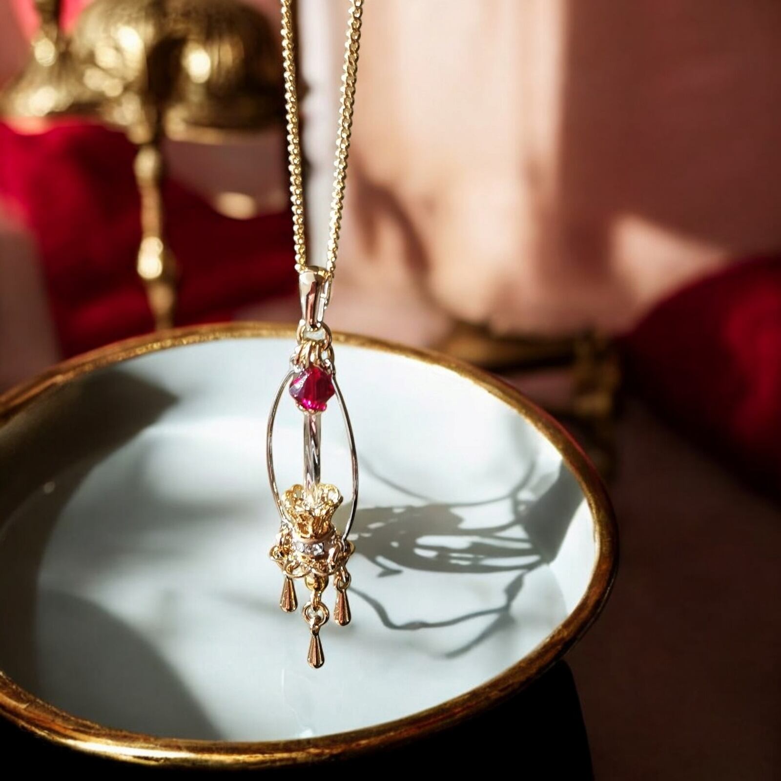 このネックレスに使われたルビーカラーの高級クリスタルビーズは、光が当たると鮮やかなカラーを見せ、身に着けるだけで華やかさと洗練された雰囲気を引き立ててくれます。