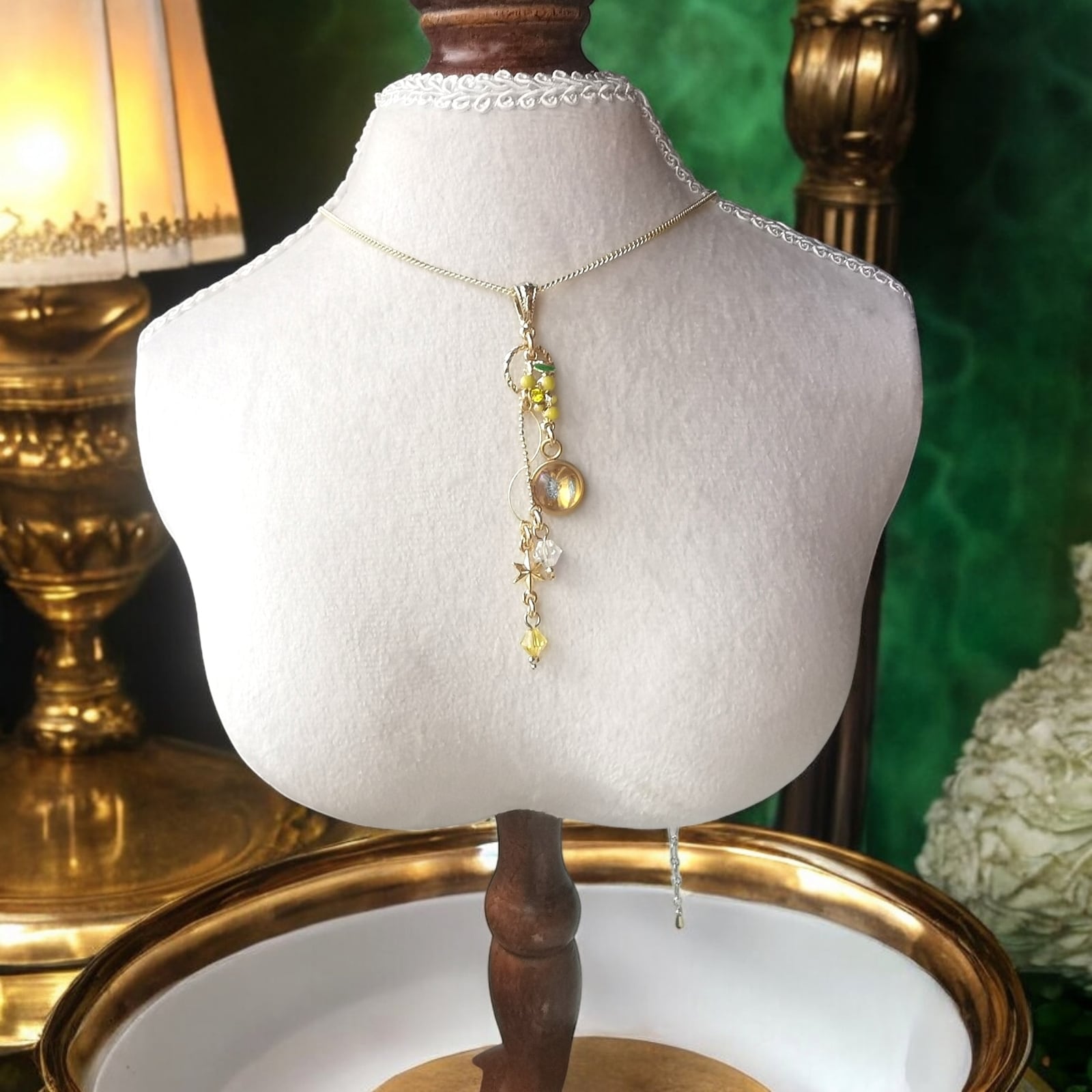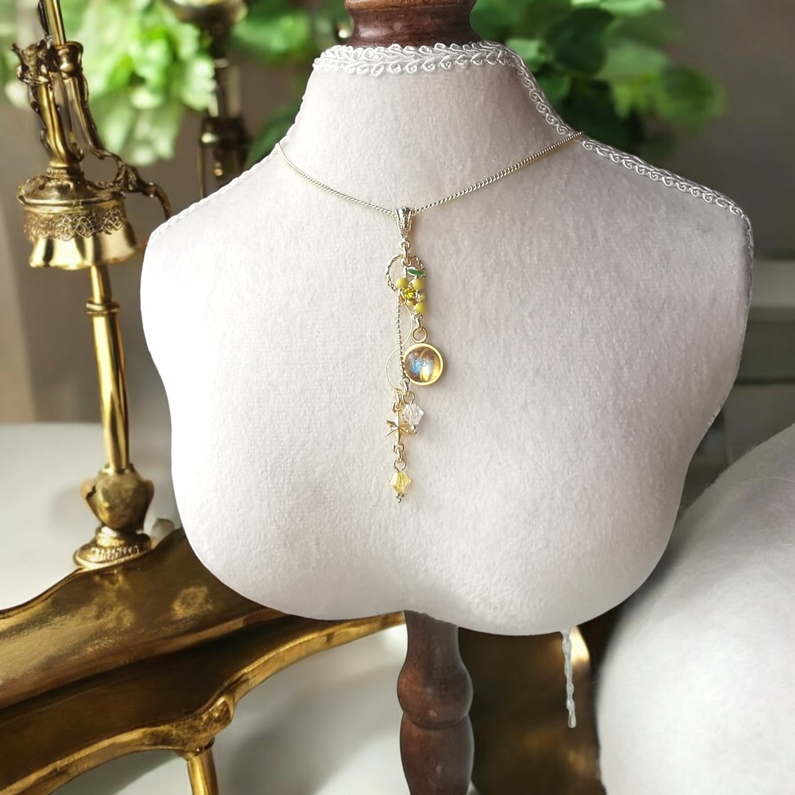 ミモザの花をモチーフにした、優雅で繊細なデザインのネックレスです。特に目を引くのは、ペンダントトップにあしらわれたラウンド型のガラスパーツ。